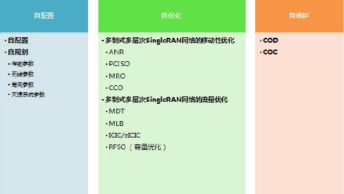SingleSON主要包括下述3類特性,即自配置,自優(yōu)化和自維護,如下圖所示: