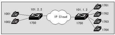 在該案例中,異地之間通過兩臺(tái)DCR 1750互連,并提供語音模塊,可直接接電話機(jī),使得異地之間可以通過IP網(wǎng)絡(luò)撥打IP語音電話。