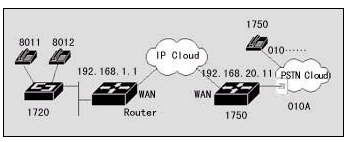 該案例中,連接到位于上海的的用戶,可以通過IP網(wǎng)絡(luò)撥打北京的PSTN用戶。位于北京的DCR 1750路由器通過 FXO接口直接連接到PSTN。假設(shè)北京可能的用戶在PSTN上的電話號碼為8位,北京的區(qū)號為010。上海的DCR 1720使用FXS端口與電話相連,北京的DCR 1750路由器使用FXO端口與PSTN上的電話端口相接,假設(shè)此端口在PSTN上的號碼為A。那么上海的用戶可以使用圖中號碼為8011(8012)的電話直接撥北京的任意電話,而北京的PSTN用戶呼叫8011(8012)電話,必須先撥號碼A,聽到二次撥號音時(shí)撥8011(8012)。在實(shí)現(xiàn)時(shí),上海的DCR 1720也可以通過器語音端口連接到PSTN,通過二次撥號,使得兩地的PSTN用戶可以通過IP網(wǎng)絡(luò)互相通話,而話費(fèi)只是市話的費(fèi)用。