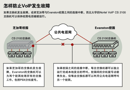 美國西北大學(xué)原來的兩臺運營商級SL-100電話交換機(jī)(一臺安裝在芝加哥校園,一臺安裝在Evanston校園)已經(jīng)用了差不多20年。升級的目標(biāo)是將兩臺獨立的交換機(jī)合并為一臺邏輯交換機(jī)來減少管理復(fù)雜性。同時,不必更換全部數(shù)字電話。最終他們決定升級到同時支持VoIP和TDM的Nortel CS 2100 VoIP,這樣用戶不用被迫把他們的電話換為VoIP電話。Carr說:“不管是那些希望利用VoIP性能的用戶,還是想繼續(xù)使用當(dāng)前電話特性和服務(wù)的用戶,可以各取所需。”