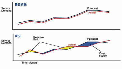 下一代網(wǎng)絡的IP化、智能化的趨勢,使得服務路徑從靜態(tài)路由為主向動態(tài)化、共享化轉(zhuǎn)變。這種轉(zhuǎn)變使得主動的網(wǎng)絡容量規(guī)劃在下一代運營環(huán)境中具有更加重要的意義。準確、真實、主動的網(wǎng)絡容量計劃和趨勢分析能力將成為對OSS解決方案的關鍵需求。網(wǎng)絡規(guī)劃不僅可以幫助運營商準確分配網(wǎng)絡容量,而且可以減少容量不足和失敗訂單,并可通過找出利用率不足的網(wǎng)絡資源來提高網(wǎng)絡運行效率,如圖3所示。