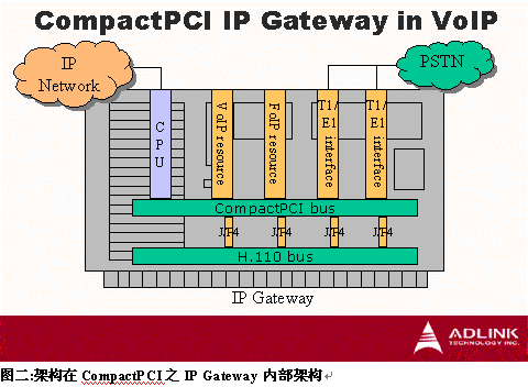 如何實現(xiàn)如此多功能的IP Gateway如圖二架構(gòu),在CompactPCI標準的背板上,整合了計算機電話領(lǐng)域常用的標準H.110 bus,提供冗余時鐘支持熱插拔板卡如VoIP、FoIP、T1/E1