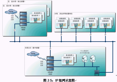 圖 2-5給出了使用純IP實施城市110組網(wǎng)的最普遍的示意。從該圖可以看出,無論采用集中接警還是分散處警,C&CC特別使用于使用純IP技術實施全市(包括所轄縣級市)110組網(wǎng)。考慮到目前全國公安二、三、四級網(wǎng)建設日漸成熟,使用純IP技術實施全市110組網(wǎng)并實現(xiàn)"三警合一"確實是經(jīng)濟、靈活而方便的選擇,前文提到的芬蘭112全國組網(wǎng)使用的也是這樣的技術。當然,現(xiàn)存的傳統(tǒng)公安通訊專網(wǎng)仍然可以作為備份話務路由存在。