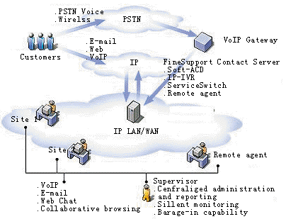 FineSupport發(fā)揮了軟交換和VoIP技術(shù)的優(yōu)勢,并融合了Internet的特性,使顧客與呼叫中心之間不僅可以通過語音進(jìn)行通信,還可以通過電子郵件、傳真、文字交談進(jìn)行通信,甚至可以實(shí)現(xiàn)在線推送網(wǎng)頁、在線網(wǎng)頁導(dǎo)航等業(yè)務(wù)。呼叫中心的客服人員只需具備一臺(tái)多媒體電腦和一副耳麥,即可向顧客提供完備的服務(wù)。