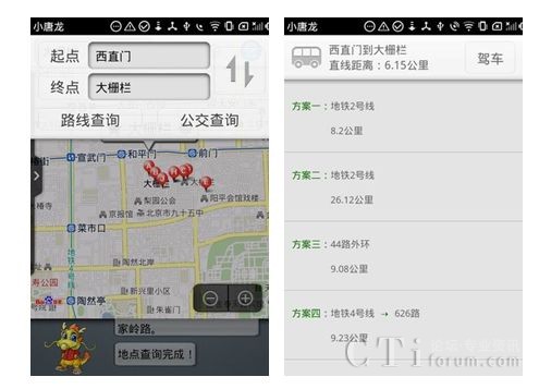 打開自駕車查詢,小唐龍做了詳細(xì)的路線引導(dǎo),同樣貼心的是公交查詢它也很快給你列出最佳的行車路線方案。另外還可將駕車路線收藏,以備日后需要時(shí)方便查詢。