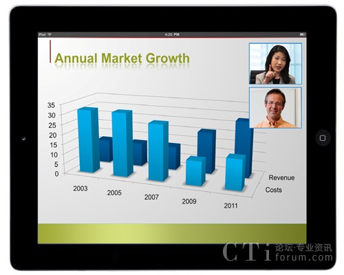 現(xiàn)在,在視頻通信需求增長(zhǎng)、勞動(dòng)力越來越偏遠(yuǎn)以及技術(shù)進(jìn)步的推動(dòng)下,移動(dòng)視頻會(huì)議正在顯著增長(zhǎng)。今天的企業(yè)往往在地域上越來越分散,越來越虛擬,全球遠(yuǎn)程辦公人員已超過10億。同時(shí),技術(shù)的進(jìn)步也推動(dòng)了視頻移動(dòng)社會(huì),包括配有攝像頭的移動(dòng)平板電腦和智能手機(jī)的普及;3G、4G和Wi-Fi網(wǎng)絡(luò)的出現(xiàn);以及云服務(wù)。事實(shí)上,Gartner仍然看好多媒體平板電腦市場(chǎng)帶來的機(jī)會(huì),據(jù)他們預(yù)測(cè)到2015年平板電腦將售出3.2億部,到年底,累計(jì)銷售將超過9億部。到2015年,采用視頻聊天的人數(shù)預(yù)計(jì)將增長(zhǎng)14倍,超過1.4億人。