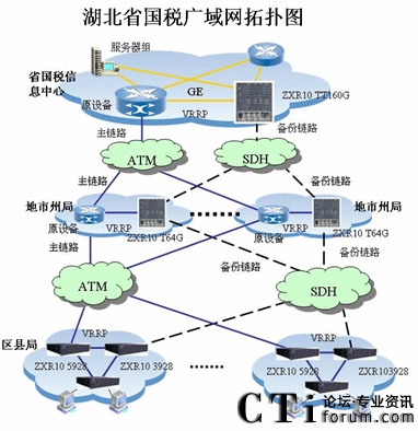 湖北省國稅三級專網(wǎng)已經(jīng)建成,但是存在單點(diǎn)單鏈路隱患,為了保證網(wǎng)絡(luò)可靠運(yùn)行,2006年湖北國稅攜手中興通訊對省國稅系統(tǒng)的網(wǎng)絡(luò)進(jìn)行備份網(wǎng)絡(luò)改造,結(jié)合稅務(wù)系統(tǒng)金稅三期網(wǎng)絡(luò)需求,網(wǎng)絡(luò)改造采用SDH線路來組建高帶寬的廣域網(wǎng)絡(luò),同時(shí)與原有的網(wǎng)絡(luò)設(shè)備(包括路由器、交換機(jī))及網(wǎng)絡(luò)接入設(shè)備實(shí)現(xiàn)互連互通,互為備份。