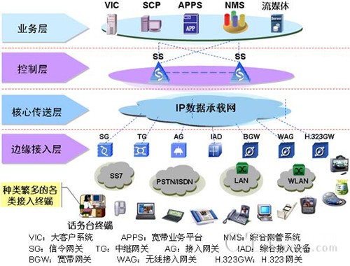 邊緣接入層:主要指與現(xiàn)有網(wǎng)絡(luò)相關(guān)的各種網(wǎng)關(guān)和新型接入終端設(shè)備,完成與現(xiàn)有各種類型的通信網(wǎng)絡(luò)的互通并提供各類通信終端(如模擬話機、SIP Phone、PC Phone、可視終端、智能終端等)到IP核心層的接入。