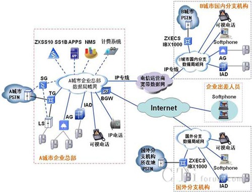 如果大型跨區(qū)域企業(yè)在各地分支機構(gòu)內(nèi)部數(shù)據(jù)局域網(wǎng)已經(jīng)完成部署,并依托電信運營商建設(shè)的公眾寬帶數(shù)據(jù)網(wǎng)提供IP專線,通過網(wǎng)間互聯(lián),組成了企業(yè)內(nèi)部統(tǒng)一的寬帶數(shù)據(jù)網(wǎng),那么就可以很方便的在整個企業(yè)實施多媒體綜合通信網(wǎng)解決方案。