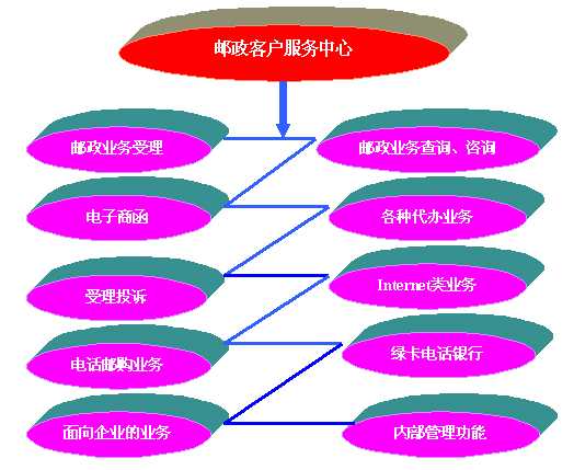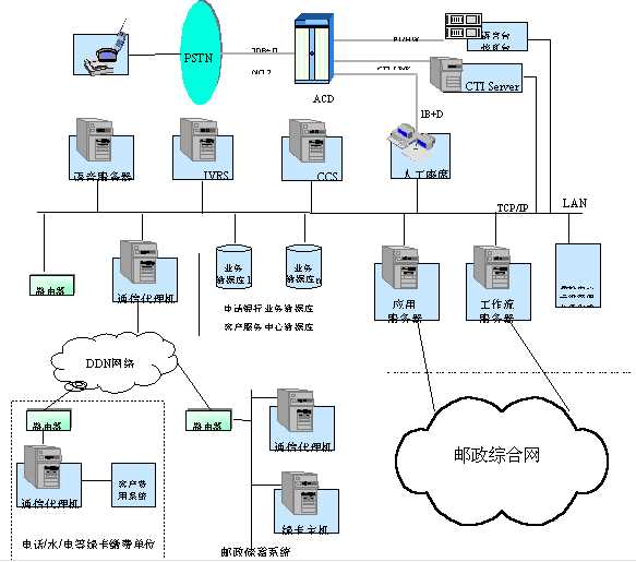 郵政呼叫中心在現(xiàn)有郵政綜合網(wǎng)的基礎(chǔ)上,利用電話(huà)服務(wù)廣泛普及,方便快捷的優(yōu)點(diǎn),采用CTI技術(shù),把綜合網(wǎng)提供的諸多并行的多種業(yè)務(wù)無(wú)縫集成,為綜合網(wǎng)提供一個(gè)集成多種服務(wù)功能為一體的橫向服務(wù)。