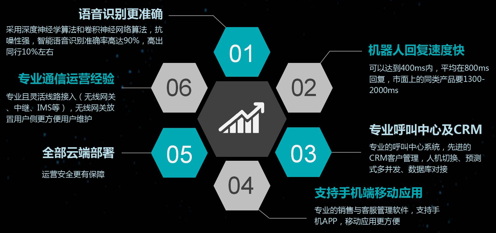 真人式語音群呼、語音識別轉(zhuǎn)化成文、客戶篩選分類管理、多維統(tǒng)計圖表、實時監(jiān)控平臺、配套的全國碼號資源及通話線路資源。
