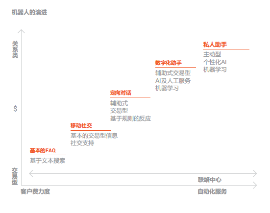 客戶服務(wù)智能化: 就是通過對服務(wù)流程的優(yōu)化或改造以支撐AI技術(shù)應(yīng)用最終達到提升人工效率和客戶體驗的過程。在用戶層面包括:語音或文本聊天機器人、實體機器人、虛擬座席、智能IVR 、智能外呼等。在座席層面包括:智能知識庫、智能工單系統(tǒng)、智能營銷輔助系統(tǒng)、流程機器人、座席學(xué)習(xí)系統(tǒng)、座席情緒感知系統(tǒng)等。在管理層面包括:智能質(zhì)檢系統(tǒng)、智監(jiān)控系統(tǒng)、智能 分析系統(tǒng)、智能排班系統(tǒng)等。