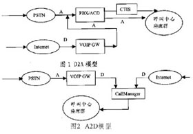 A2D法(Analog to Data) A2D法即事先將呼入呼叫中心的DTMF電話通過VoIP網(wǎng)關轉化為IP電話,再和來自Internet的IP電話一同接入座席代表。A2D法實現(xiàn)相對比較麻煩,但其將絕大部分工作放到計算機網(wǎng)絡這個開放的軟件平臺來做,除了有利于更新和開發(fā)外,還能降低成本。同時,這種結構能在地理上和物理上伸縮自如,不僅便于高度集成,而且便于跨地區(qū)構建。
