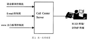 目前,IP Call Center實現(xiàn)綜合媒體統(tǒng)一處理的方式已取得比較一致觀點,即如圖3的語音媒體流和IP傳真、Web主頁、Email進入座席群前先經過一個服務軟件進行統(tǒng)一處理,該服務軟件一般廠家都稱為Call Center Server(簡稱CCS服務器),它起著完成呼叫控制、路由處理、與呼叫同步的用戶數(shù)據(jù)管理及信息監(jiān)視等作用。
