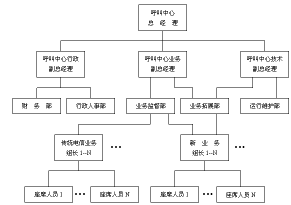 上圖是我們建議的呼叫中心組織結(jié)構(gòu)圖,其中業(yè)務(wù)監(jiān)督部門、業(yè)務(wù)拓展部門和運行維護部門是呼叫中心最關(guān)鍵的部門,財務(wù)部和行政人事部是三大核心部門的支撐部門。