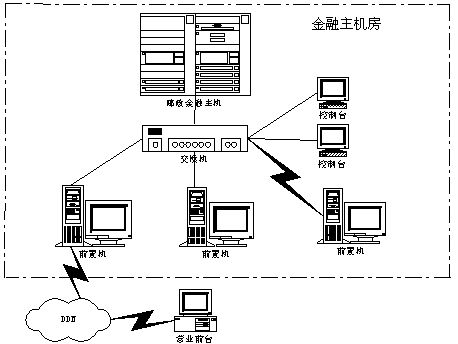 郵政儲蓄金融主機房主要包含金融主機、前置機及網(wǎng)絡通信設施。其結構示意圖如下。