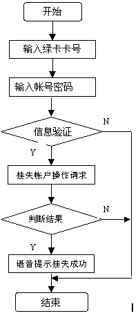 此功能為用戶提供賬號臨時掛失業(yè)務(wù),使用戶的損失減到最小。 用戶通過特定的接入碼進(jìn)入呼叫中心,選擇賬戶掛失后,呼叫中心語音提示用戶輸入帳號密碼,平臺將用戶的數(shù)據(jù)送至金融主機(jī)系統(tǒng),然后根據(jù)返回的信息將處理結(jié)果語音提示給用戶。用戶臨時掛失后,還必須到營業(yè)前臺進(jìn)行正式的掛失操作。流程圖如下圖。