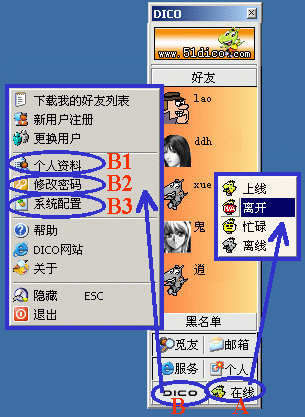 1、在線狀態(tài)設(shè)置:點(diǎn)按主窗口右下角(圖3的A處)后,可選擇"上線/離開/忙碌/離線"四種在線狀態(tài)之一;