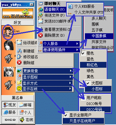 用申請時的用戶名及密碼登錄后(咦~~你會發(fā)現(xiàn)其主界面與QQ差不多哦),你可對自己的DICO進(jìn)行常規(guī)性設(shè)置(下圖3)。