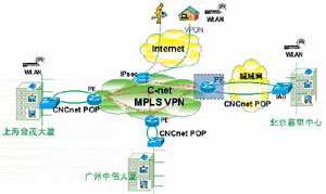 VPN中,實現(xiàn)業(yè)務(wù)在VLAN 和VPN中的無縫對接,以保證用戶數(shù)據(jù)的安全、高效傳輸;接入網(wǎng)采用基于RPR或SDH的MSPP環(huán)實現(xiàn)IP業(yè)務(wù)和TDM業(yè)務(wù)的綜合傳輸;在商業(yè)樓宇內(nèi)主要采用IAD設(shè)備將客戶的數(shù)據(jù)、語音、專線等業(yè)務(wù)接入CNC
