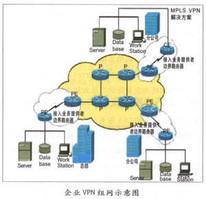下圖是提供VPN業(yè)務(wù)的例子。其中業(yè)務(wù)提供者邊界路由器(PE)相當(dāng)于MPLS區(qū)域邊界路由器(LER),它了解整個MPLS VPN的網(wǎng)絡(luò)拓撲結(jié)構(gòu)。用戶邊界路由器(CE)可以只是一個