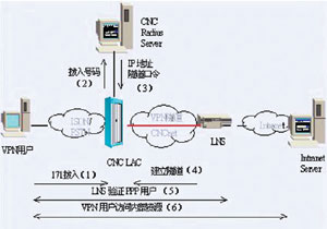 在網通有限公司為中建總公司建設的網絡中,當用戶撥上網絡時,網通有限公司的認證系統(tǒng)會根據帶域名的用戶名確定是哪個地區(qū)的VPDN用戶,并通過一系列步驟實現(xiàn)用戶與企業(yè)之間的內部通信。