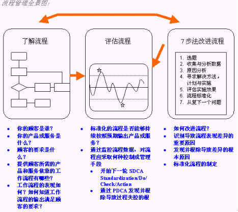 "TQM"核心思想究竟是什么呢?簡(jiǎn)言之,"TQM"分為三步:了解流程,檢討流程,改進(jìn)流程。下圖可以很好說明這種思想: