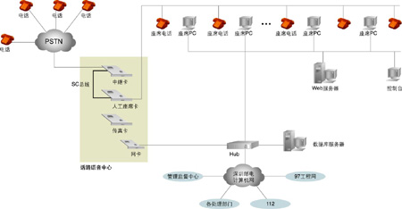 系統(tǒng)的核心是話路語(yǔ)音中心,主要實(shí)現(xiàn)兩大功能: 一是實(shí)現(xiàn)180系統(tǒng)的話路語(yǔ)音平臺(tái); 二是實(shí)現(xiàn)與電話網(wǎng)絡(luò)的接口。以1臺(tái)Pentium級(jí)工控機(jī)作為處理平臺(tái),2塊30線數(shù)字中繼語(yǔ)音處理卡,1塊帶振鈴器的24線模擬座席電話轉(zhuǎn)接卡,1塊4路傳真卡,卡間以語(yǔ)音處理行業(yè)的標(biāo)準(zhǔn)總線SC總線相連。系統(tǒng)與電信網(wǎng)絡(luò)的接口采用E1數(shù)字中繼線,信令方式采用中國(guó)一號(hào)信令為隨路信令,工控機(jī)用TCP/IP協(xié)議與局域網(wǎng)相連。