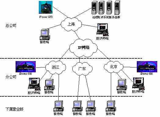 某證券公司有三級網(wǎng)絡(luò),總公司、分公司和下屬營業(yè)部?偣镜椒止編捠2M,在總公司配置一套會議室型電視會議終端POLYCOM 970和一套多點(diǎn)會議服務(wù)器Radvision ViaIP400。在分公司配置了38套會議室型電視會議終端POLYCOM 680,用于與總公司進(jìn)行雙向視頻會議。分公司到營業(yè)部帶寬是512K,各營業(yè)部安裝遠(yuǎn)程股評系統(tǒng)接收端程序,遠(yuǎn)程股評系統(tǒng)服務(wù)器都放置在海通總公司。當(dāng)在總公司進(jìn)行股評時,總公司本地?cái)z像頭拍攝教師畫面,MIC采集教師聲音,傳給服務(wù)器編碼,再通過網(wǎng)絡(luò)供各個接收端接收;當(dāng)在分公司進(jìn)行股評時,首先分公司的電視會議設(shè)備采集教師畫面及聲音傳回總公司的電視會議設(shè)備,再傳給遠(yuǎn)程股評系統(tǒng)的服務(wù)器進(jìn)行編碼,然后通過網(wǎng)絡(luò)發(fā)布,供接收端接收。(結(jié)構(gòu)如下圖)