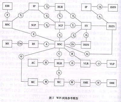 在基于CDMA的無線智能網(wǎng)方面,北美的TIA/EIA組織頒布了基于CS-2的無線智能網(wǎng)規(guī)范WIN。WIN分為三個階段:階段一、預(yù)付費階段和階段二。其中階段一支持的主要業(yè)務(wù)有來話篩選業(yè)務(wù),主叫名字顯示業(yè)務(wù)和語音控制的業(yè)務(wù),預(yù)付費階段主要支持預(yù)付費業(yè)務(wù),階段二支持被叫集中付費,立即付費等五種業(yè)務(wù)。WIN網(wǎng)絡(luò)參考模型如圖2所示。