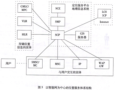 基于智能網(wǎng)的位置業(yè)務(wù)體系結(jié)構(gòu)如圖3所示。在此系統(tǒng)里,SCP一方面與網(wǎng)絡(luò)中存儲位置信息的實體(如HLR、GMLC/MPC等)互連,以獲取位置信息;另一方面與內(nèi)部的地理信息系統(tǒng)(GIS)服務(wù)器和Internet上的LCS