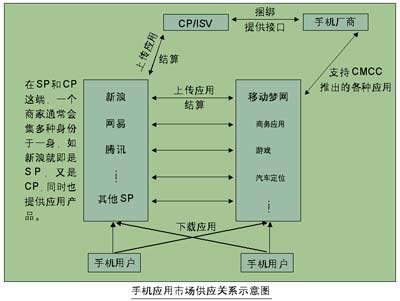在這樣一個全新的銷售模式下,運(yùn)營商的作用也越發(fā)凸顯出來。“夢網(wǎng)是一個大的平臺,SP是個小平臺,SP再通過與CP建立合作,進(jìn)而將整個應(yīng)用市場與終端連接起來,F(xiàn)在,我們?nèi)康膽?yīng)用都放到夢網(wǎng)上面了!北本﹫笸娮由虅(wù)公司的一個工作人員說。移動夢網(wǎng)的建立,事實(shí)上在手機(jī)廠商、應(yīng)用開發(fā)商、用戶三者之間搭了一個橋梁,將各種手機(jī)應(yīng)用集中在一個門戶網(wǎng)站,用戶需要時,只需登陸到夢網(wǎng)上面,點(diǎn)擊相關(guān)的網(wǎng)頁,就可隨時下載所需要的應(yīng)用。