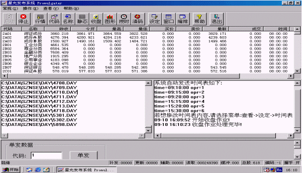 中匯金融信息臺(tái)股票信息發(fā)布系統(tǒng)是中匯金融信息臺(tái)同星傳通信科技(深圳)有限公司共同開發(fā)研制的新一代高速股票信息發(fā)布系統(tǒng),它配合中匯金融信息臺(tái)現(xiàn)行使用的星光產(chǎn)SP658、SP659、SP688高速股票機(jī),實(shí)現(xiàn)深、滬兩市證券交易行情的實(shí)時(shí)發(fā)布,刷新速度最快可達(dá)20秒/遍,是目前全國(guó)刷新速度最快的尋呼股票發(fā)布系統(tǒng)之一。該系統(tǒng)兼顧多種信息源輸入格式,配置靈活,采用最為普及和成熟的POCSAG尋呼編碼技術(shù),最大限度地為用戶節(jié)約運(yùn)營(yíng)成本。該發(fā)布系統(tǒng)集信息源接收和信息發(fā)布于一臺(tái)PC機(jī)中,一邊接收?qǐng)D文電視的股票數(shù)據(jù),一邊整理發(fā)送到編碼器,不但節(jié)約了電腦設(shè)備,而且避免了信息上網(wǎng)交換帶來的延遲,不愧為一種經(jīng)濟(jì)快捷的發(fā)送方式。