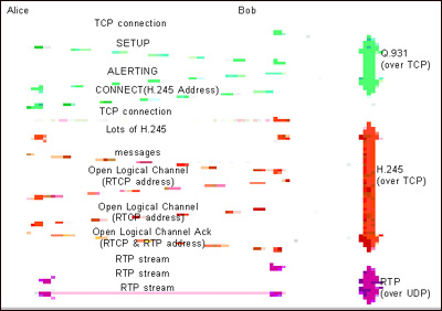 然后,Bob和Alice在此連接上發(fā)送Q.931包。,在這些交換的數(shù)據(jù)包中,Bob和Alice發(fā)送動態(tài)的端口用于建立H.245連接(即上圖CONNECT數(shù)據(jù)包中的H.245 Address)。