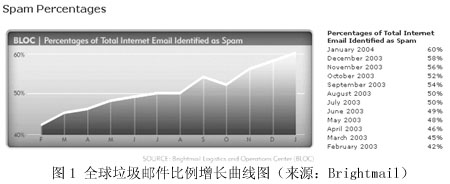 圖1來自著名的反垃圾郵件先鋒Brightmail公司的網(wǎng)站,顯示了最近12個月來,全球范圍內(nèi)垃圾郵件在所有郵件中所占比例的增長曲線圖。按Brightmail的統(tǒng)計結果,2003年3月,垃圾郵件在全球郵件總量中的比例是45%,其后的一年間,平均每個月增長兩個百分點。到了今年2月,這個比例已經(jīng)達到62%,也就是說,現(xiàn)在全球每5封電子郵件中就有3封是有害無益的垃圾郵件。