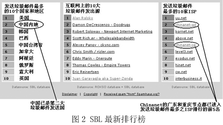 圖2是國際上著名的反垃圾郵件組織Spamhaus在網(wǎng)站上列出的統(tǒng)計排行榜,“China”已經(jīng)穩(wěn)居第二大垃圾郵件發(fā)送國的位置,而右邊的一個排行榜則從另一個角度向我國敲響了警鐘——在專為發(fā)送垃圾郵件的ISP所列的黑名單SBL中,我國Chinanet的兩個省級ISP在前10名中分列第2和第5名。而Chinanet作為中國的公用信息互聯(lián)網(wǎng)絡,是我國的Internet骨干網(wǎng),是國內(nèi)用戶接入互聯(lián)網(wǎng)的主要途徑之一!拔覀冋娌幌M赃@樣的方式‘揚名海外’”,來自一家ISP的一位不肯透露姓名的女士說,“其實我們也是受害者!”