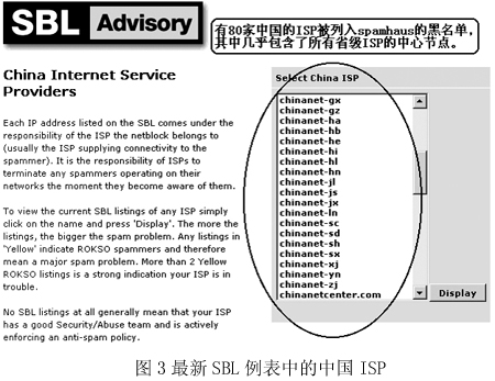 垃圾郵件損害的不只是中國的國際形象,中國反垃圾郵件聯(lián)盟的葉豪告訴記者,類似SBL(更一般的是RBL,即“實時黑名單”)這樣的服務是由國外的一些公司或第三方組織提供的,目前已經(jīng)成為國際上比較通行的防范垃圾郵件的措施。而在具備較高知名度的Spamhaus所維護的這份黑名單中,我國的ISP竟然多達80家(如圖3),幾乎所有的省級ISP都位列其中。“中國很多大的ISP都在不同的‘黑名單’里,從這些國內(nèi)ISP發(fā)出的郵件,那些用‘黑名單’的客戶根本就收不到,F(xiàn)在‘黑名單’是比較好用的一種辦法,所以使用‘黑名單’服務的企業(yè)也越來越多,國際上針對中國的信息壁壘就越來越厲害,再不采取措施,中國就等著被全世界‘封掉’吧!”