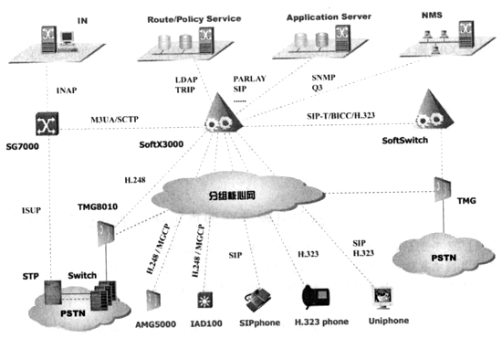 總之,基于IP軟交換的網(wǎng)絡(luò)是一個融合網(wǎng)絡(luò),包括PSTN/ISDN、H.323、ATM/IP等各種網(wǎng)絡(luò)。SIP協(xié)議是NGN多媒體通信協(xié)議,用于軟交換、SIP服務(wù)器和SIP終端之間的通信控制和信息交互,擴展的SIP-T可使SIP消息攜帶ISUP信令;在需要媒體轉(zhuǎn)換的地方可設(shè)置媒體網(wǎng)關(guān),H.248/Megaco為媒體網(wǎng)關(guān)控制器(MGC),用于控制媒體網(wǎng)關(guān),完成媒體轉(zhuǎn)換功能,它并不負(fù)責(zé)呼叫控制功能;H.323也是多媒體通信協(xié)議,它比SIP、H.248/Megaco的發(fā)展歷史更長,是一項復(fù)雜的協(xié)議,升級和擴展性不是很好,SIP+H.248/Megaco可取代H.323,為了與H.323網(wǎng)絡(luò)互通,NGN必須支持該項協(xié)議;SIGTRAN用于解決IP網(wǎng)絡(luò)承載七號信令的問題,它允許七號信令穿過IP網(wǎng)絡(luò)到達目的地;BICC可使ISUP協(xié)議在不同承載網(wǎng)絡(luò)(ATM、IP、PSTN)上傳送。