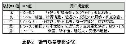 對(duì)于IP電話質(zhì)量的評(píng)價(jià)采用MOS(主觀平均評(píng)分)值評(píng)價(jià),評(píng)測(cè)方法在ITU-TP.800中定義。實(shí)際中可以采用PESQ(語(yǔ)音質(zhì)量的知覺(jué)評(píng)估)客觀測(cè)試方法,在ITU-TP.862(PESQ)中定義。MOS值的定義如下表所示: