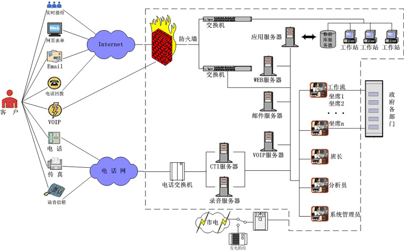 1.呼叫中心:提供傳統(tǒng)呼叫中心功能,實(shí)現(xiàn)電話網(wǎng)絡(luò)的呼入呼出、座席管理和數(shù)據(jù)庫維護(hù)等;