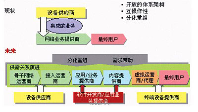 軟交換已經(jīng)從一種單純的技術(shù)發(fā)展成為網(wǎng)絡(luò)演進(jìn)中的一種理念,這種理念的一個(gè)核心就是更加開放。而傳統(tǒng)運(yùn)營(yíng)商由垂直化的網(wǎng)絡(luò)、業(yè)務(wù)一體化對(duì)用戶“絕對(duì)控制”狀態(tài)走向開放化、平臺(tái)化管理的多業(yè)務(wù)單元共同參與的價(jià)值鏈最終方向,的確需要長(zhǎng)期的過程。并且,這種發(fā)展過程的決定因素將不取決于技術(shù)發(fā)展的成熟與否,而是鏈條中各成員的生存狀態(tài)與利益分配。正如文中提到的,隨著網(wǎng)絡(luò)和應(yīng)用的不斷發(fā)展,業(yè)務(wù)與網(wǎng)絡(luò)的關(guān)系、運(yùn)營(yíng)商和業(yè)務(wù)經(jīng)營(yíng)者的角色都將發(fā)生改變。
