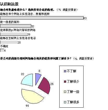從更為廣泛的層面上看,我們的調查結果顯示:三分之一的管理人員對融合網絡的益處一無所知或者知之甚少。困惑的并不僅是高級經理們:分析公司IDC近期對歐洲600余名廣域網管理人員進行的調查顯示,只有五分之一的人能夠完全了解融合網絡所實現的各項功能。