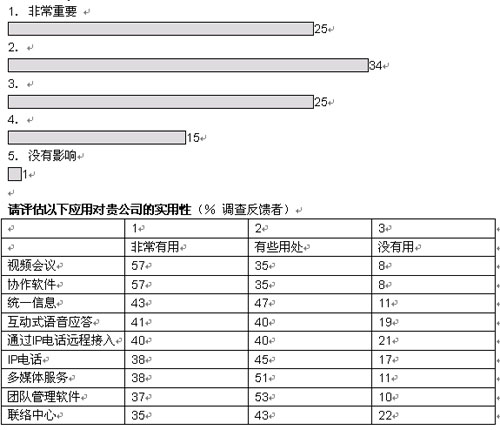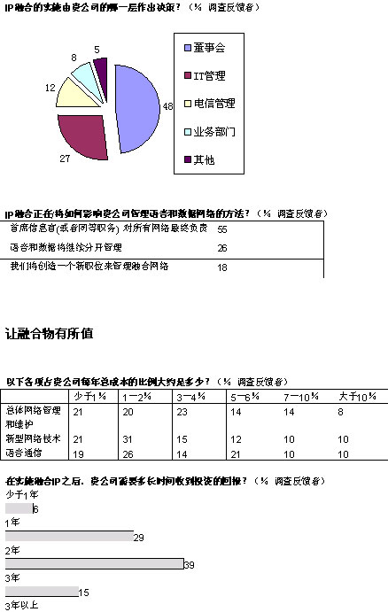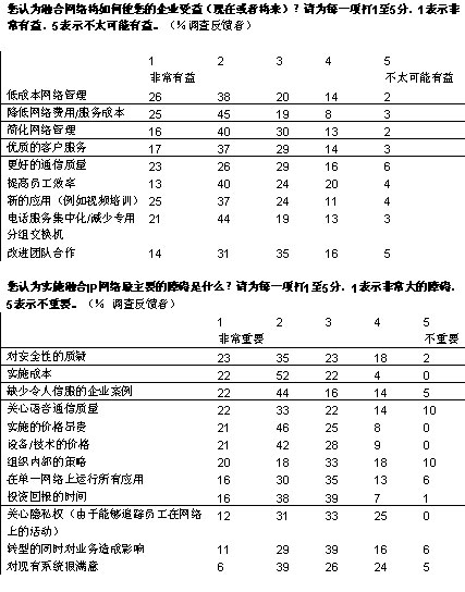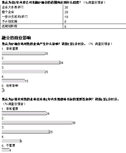 •   我們調查的企業(yè)中,有超過三分之二將在未來五年內實現大多數或者所有部門向融合網絡的轉型。大部分企業(yè)采取按部就班的形式在某些特殊部門和業(yè)務開始部署。在融合應用中,IP語音電話將在未來三年內吸引大量投資;管理人士期望通過大幅削減公司內部的通話費用獲得早期的回報。在更廣泛的層面上,大多數管理者預計,融合網絡對其企業(yè)的商業(yè)影響將會“非常重要”或者“重要”。