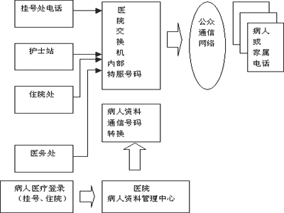 交換機(jī)識(shí)別了病人代碼后,自動(dòng)轉(zhuǎn)換成病人和其家屬的通信工具號(hào)碼呼出,所用電話上顯示的是病人代碼,實(shí)現(xiàn)了呼叫過(guò)程與號(hào)碼隔離。