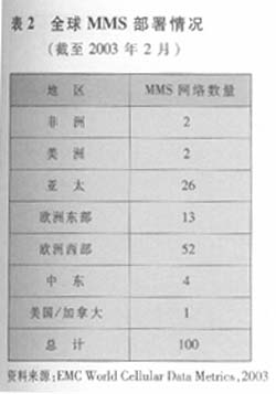 據(jù)EMC統(tǒng)計(jì),到2003年2月,全球在47國(guó)家有100家運(yùn)營(yíng)商部署了MMS網(wǎng)絡(luò)(見表2)。
