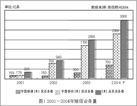 預(yù)計2004年的短信發(fā)送量將達到3000億條,其中中國移動為2300億條,中國聯(lián)通為700億條,具體如圖1所示。并且,隨著用戶逐漸習(xí)慣使用SMS業(yè)務(wù),SMS用戶數(shù)占手機用戶數(shù)的比例會略有增加。