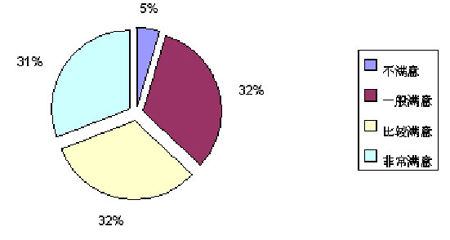 對于短信業(yè)務(wù)的使用情況,僅有31%的用戶認為非常滿意,認為比較滿意的用戶比較多,其比例占樣本總量的32%。認為一般滿意和不滿意的用戶比例分別是32%和5%(見圖3)。