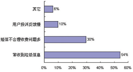 調(diào)研結(jié)果顯示,用戶對目前經(jīng)常收到垃圾信息表示不滿比例高達54%;其次是短信費用問題,用戶的不滿意見也比較多,例如短信的訂閱與退訂,對于一些短信費用的不合理收取、一些訂閱業(yè)務(wù)無法取消等等,該比例為30%;另外有10%左右的用戶對解決投訴的及時性和有效性表示了不滿。