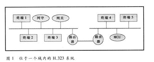 一個(gè)簡(jiǎn)單的基于H.323的視訊會(huì)議系統(tǒng)包括網(wǎng)守(GK)、網(wǎng)關(guān)(GW)、多點(diǎn)控制單元(MCU)和所有終端的集合。圖1是在常見(jiàn)的一種域類型中的H.323系統(tǒng)。