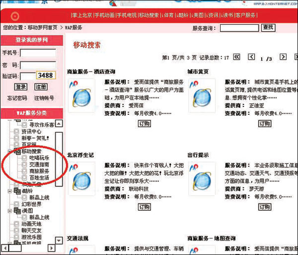 圖1 移動(dòng)運(yùn)營(yíng)商網(wǎng)站上列出的移動(dòng)搜索業(yè)務(wù)分類